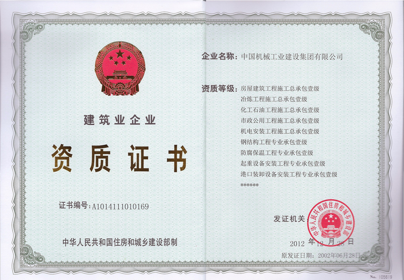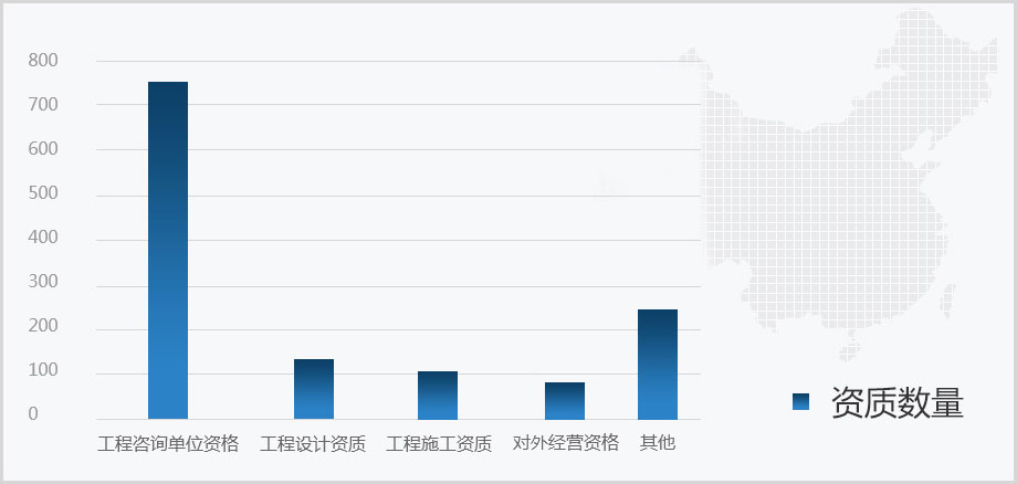 集团及所属企业目前具备由国家住建部、发改委、商务部、质检总局、工信部等国家部委行政许可的各类企业资质1000多项,以及更多的地方政府、协会批复的资质证书,每年经集团初审上报通过的各类企业资质300多项。